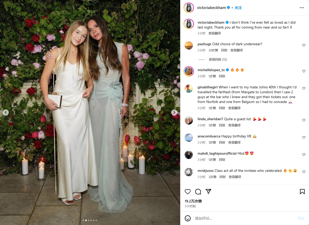 维多利亚今日晒出50岁生日宴的一些照片,其中12岁的小七身穿长裙亮相。