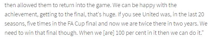 滕哈赫:“这是复杂的感受。我们进决赛的方式并不好,我们本该更好掌控比赛,但这也是出色表现。如果你分析比赛,我们控制了75分钟,但随后又给了他们机会。我们对这一成就感到开心,进入决赛,这是巨大成就。如果你看看曼联的过去,在过去20个赛季,5次进入足总杯决赛,现在我们两年两进决赛。我们需要赢下决赛,如果我们有100%状态,我们能做到。”
