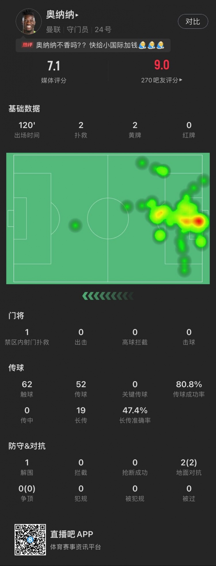 4月22日消息 足总杯半决赛,曼联在点球大战中淘汰英冠球队考文垂,将在决赛中和曼城上演曼市德比。本场比赛,奥纳纳在点球大战中扑点,获评Sofascore7.1分的评分。