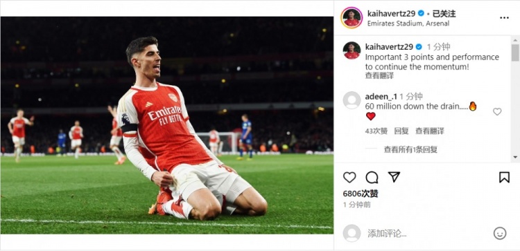 哈弗茨晒出了自己滑跪庆祝的照片,并配文:重要的3分,继续保持势头!