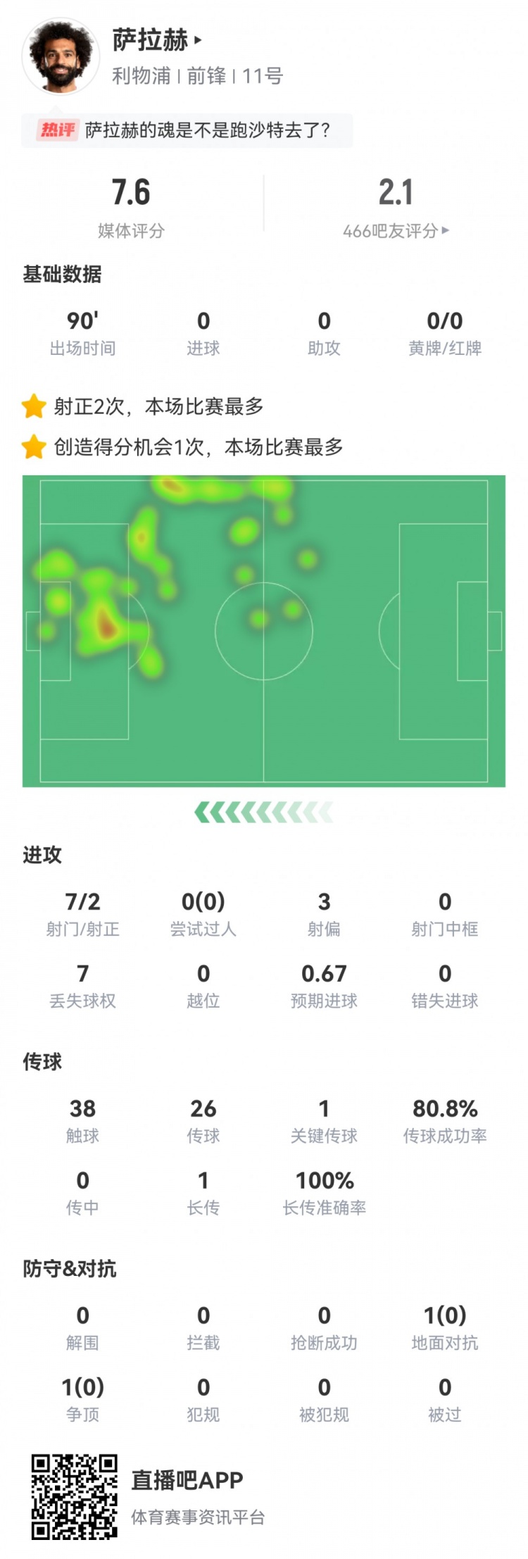 4月25日消息 英超第29轮补赛,利物浦0-2客负埃弗顿。此役萨拉赫首发打满全场,球员全场重点数据如下↓