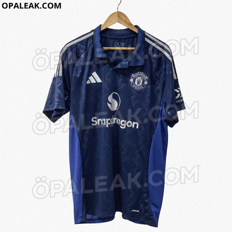 从谍照看到,曼联2024-25赛季的客场球衣为两种蓝色搭配,球衣胸前和后背为海军蓝色,下摆和两侧则搭配另一种蓝色。
