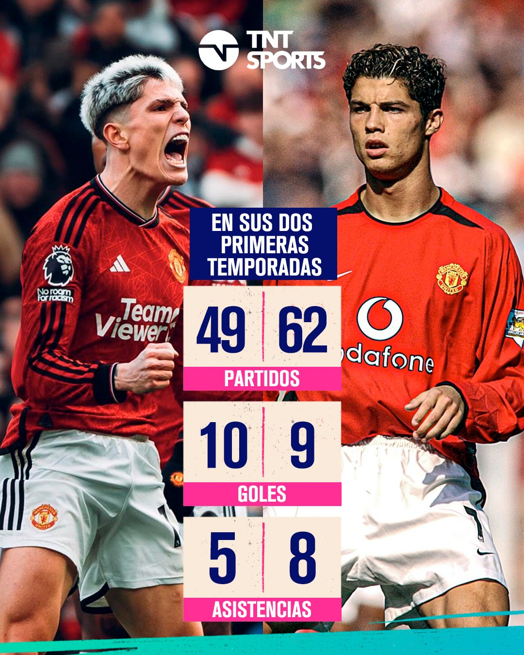 04月27日消息 TNT阿根廷体育晒出加纳乔与C罗在曼联效力的前两个赛季联赛数据对比。