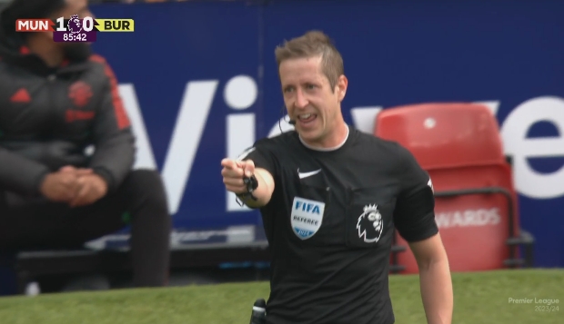 04月27日消息 英超第35轮,曼联主场被伯恩利逼平,本场裁判多次做出争议判罚。