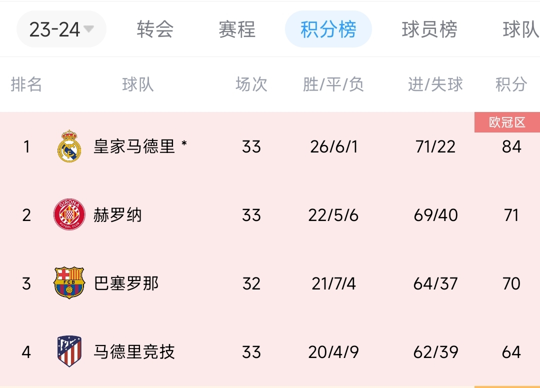 其中西甲榜首皇马,当前领先第2的赫罗纳13分,在西甲仅剩5轮的情况下,皇马将大概率提前夺冠。(即使第3少赛一场的巴萨补赛赢球,皇马领先优势也有11分)