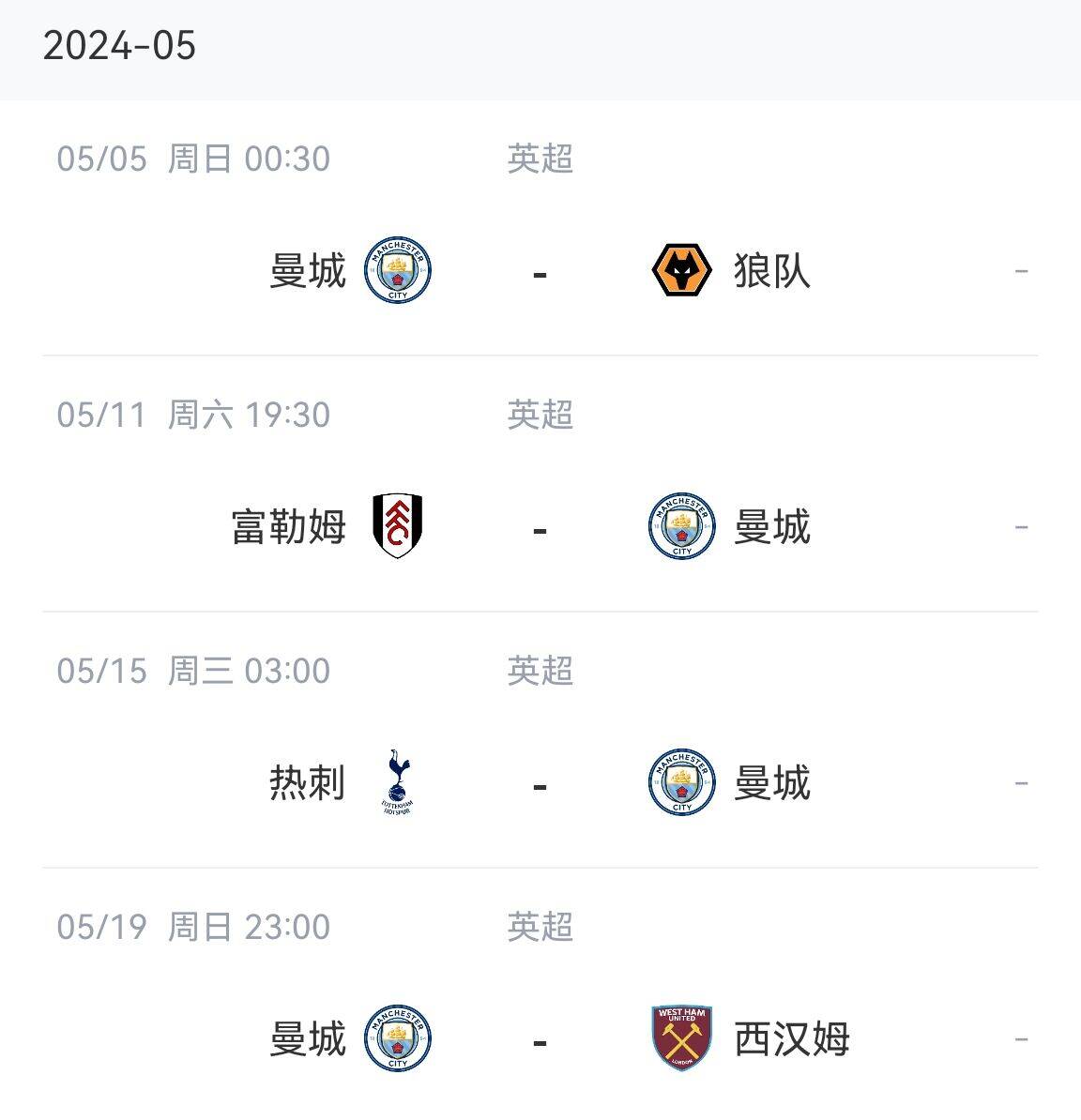 曼城还剩4场英超,对手分别为狼队、富勒姆、热刺和西汉姆↓