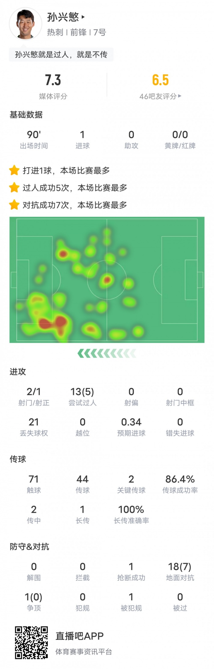 孙兴慜本场比赛数据如下: