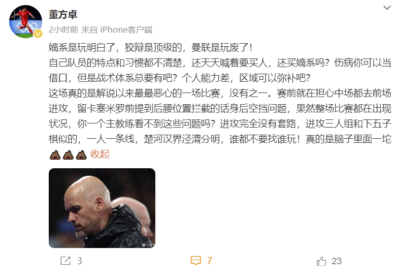 05月07日消息 本轮英超,曼联0-4惨负于水晶宫。曼联旧将董方卓发文点评。