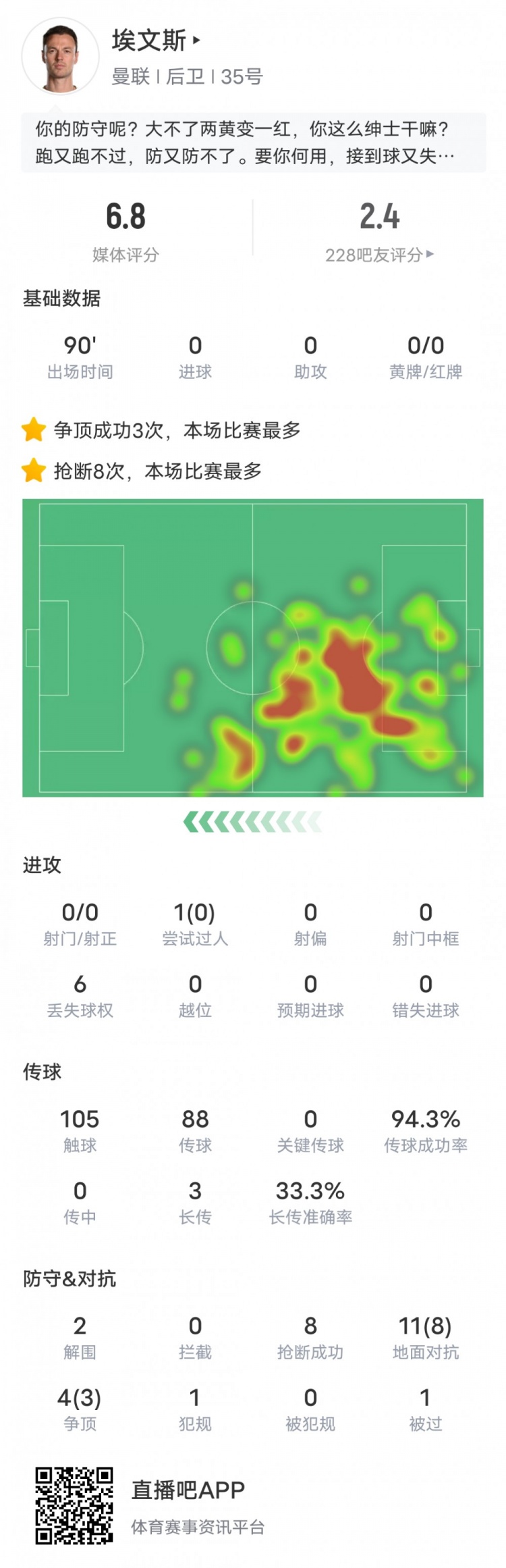 5月7日消息 在0-4不敌水晶宫的比赛中,曼联后卫埃文斯首发出战,打满全场,贡献8次抢断,11次地面对抗8次成功,评分6.8。