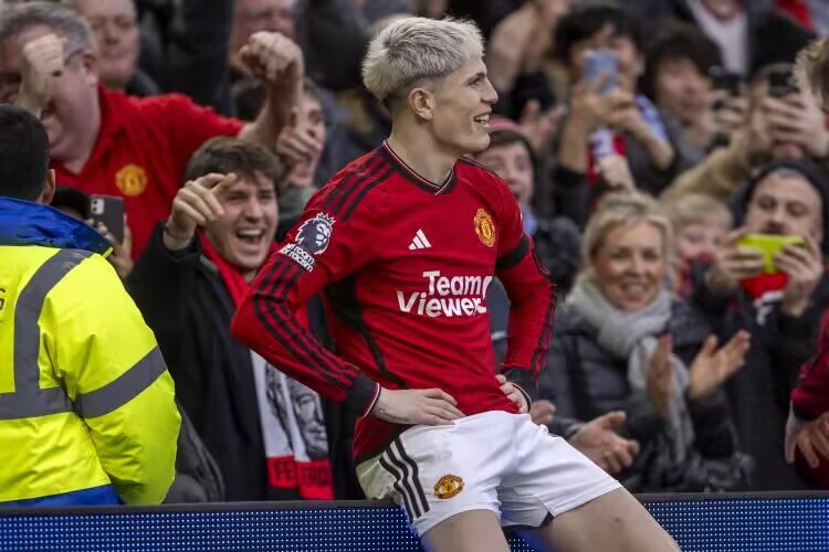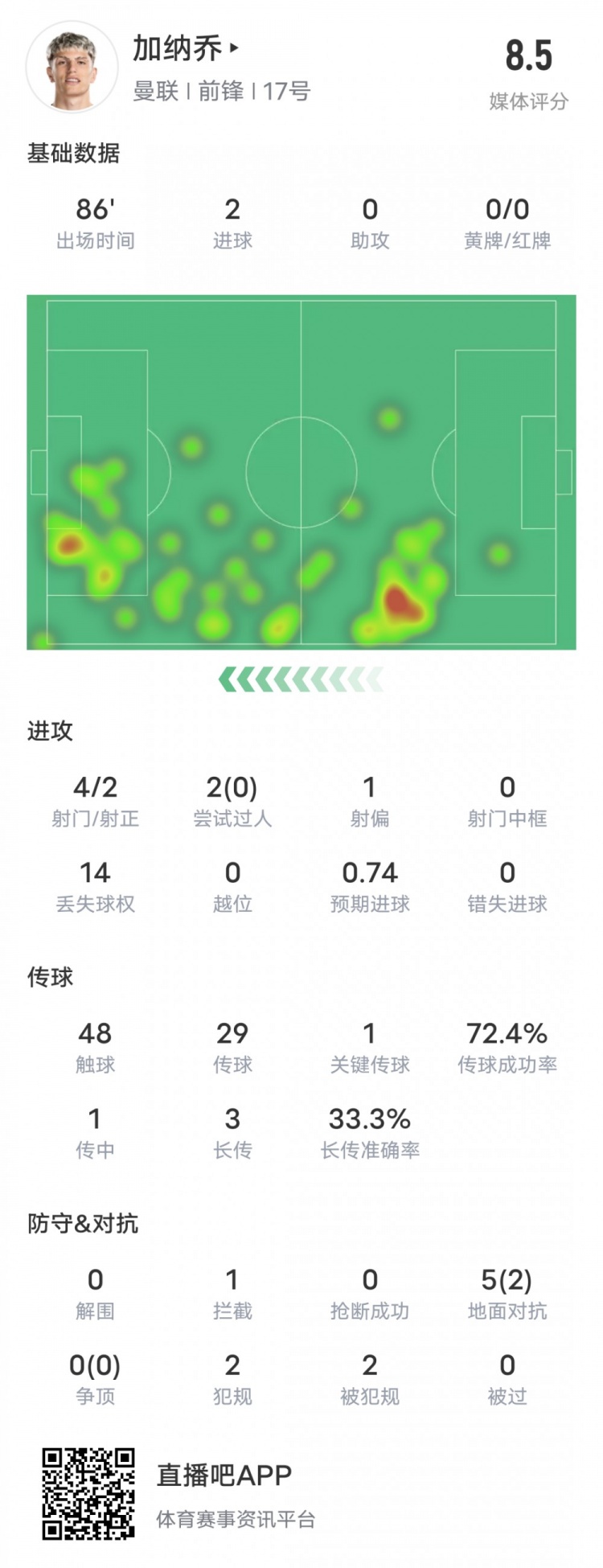 加纳乔本场比赛数据:4射2正2进球1关键传球,评分8.5