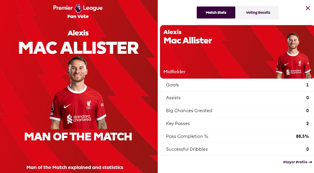 精彩世界波!英超官方:麦卡利斯特当选利物浦3-1谢菲联全场最佳