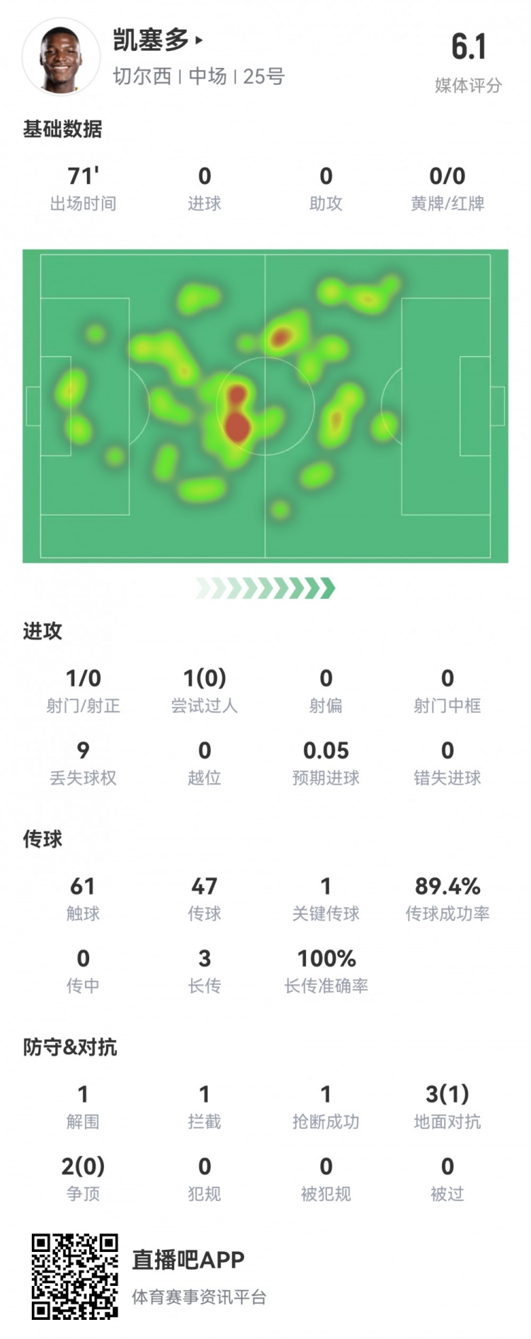 凯塞多本场数据:1次关键传球,1次失误致丢球,评分仅6.1