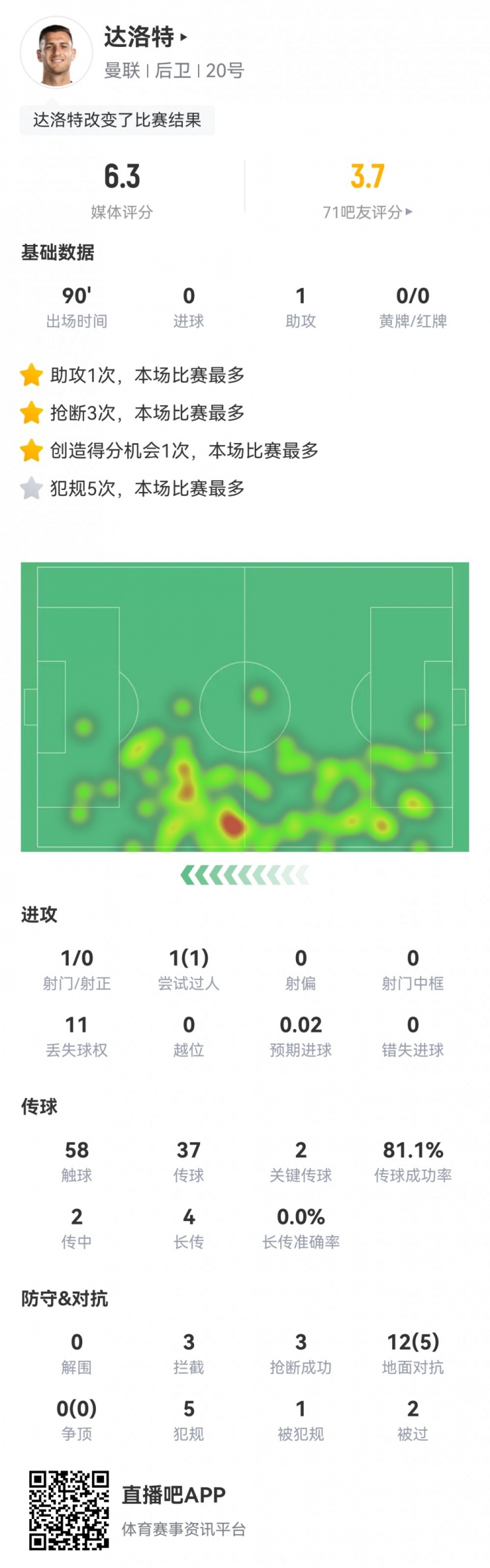 达洛特本场数据:1次助攻,1次送点,1次创造良机,2次关键传球