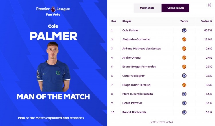 毫无悬念!帕尔默绝对优势当选英超官方全场最佳球员