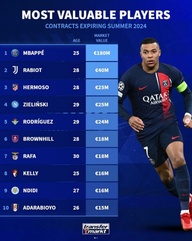 德转盘点合同年球员身价:姆巴佩1.8亿欧居首,拉比奥特第二