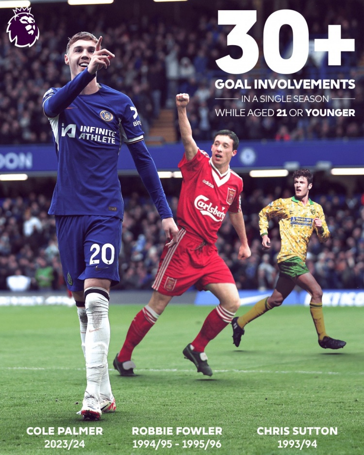 压哨!帕尔默是英超第3位单季参与30+球的21岁球员 明天就22啦