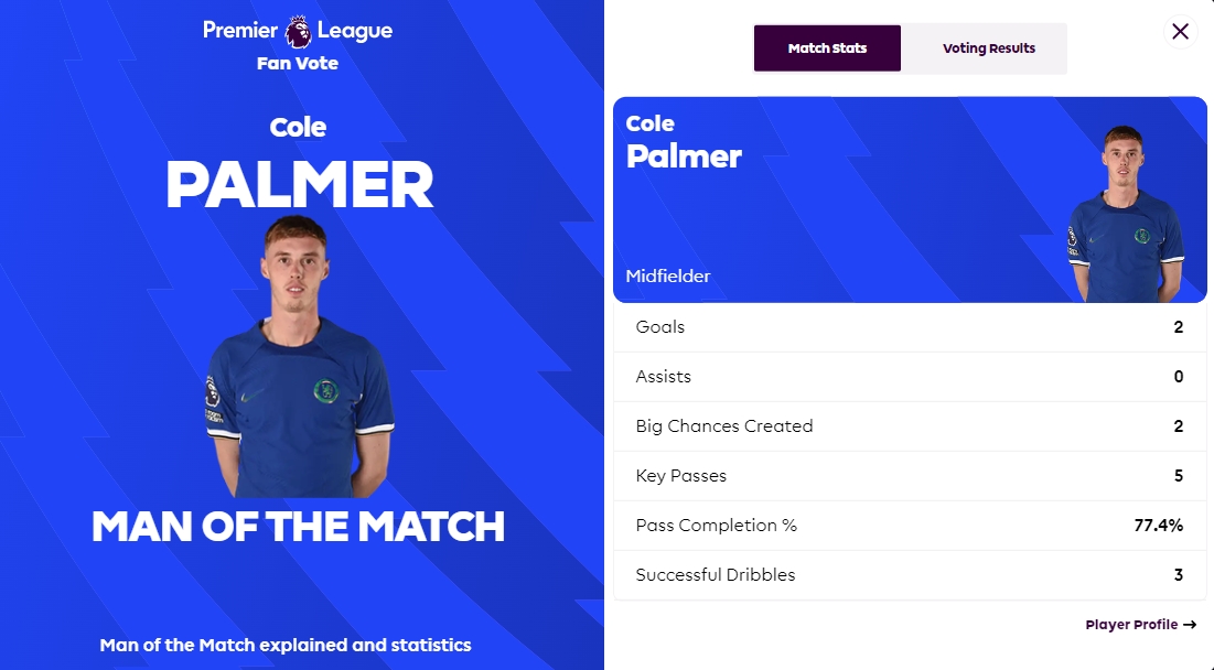 带不动????官方:帕尔默当选切尔西2-2伯恩利全场最佳,本场双响