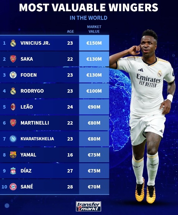 德转更新边锋身价榜:皇马阿森纳各2将,福登、莱奥在列