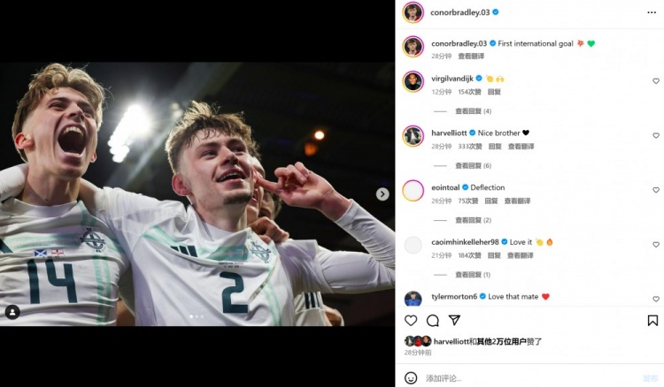 布拉德利社媒庆祝斩获国家队生涯首球,范迪克等利物浦众将道贺