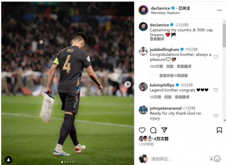 赖斯社媒庆祝担任英格兰队长&出战50场里程碑,贝林留言表示祝贺