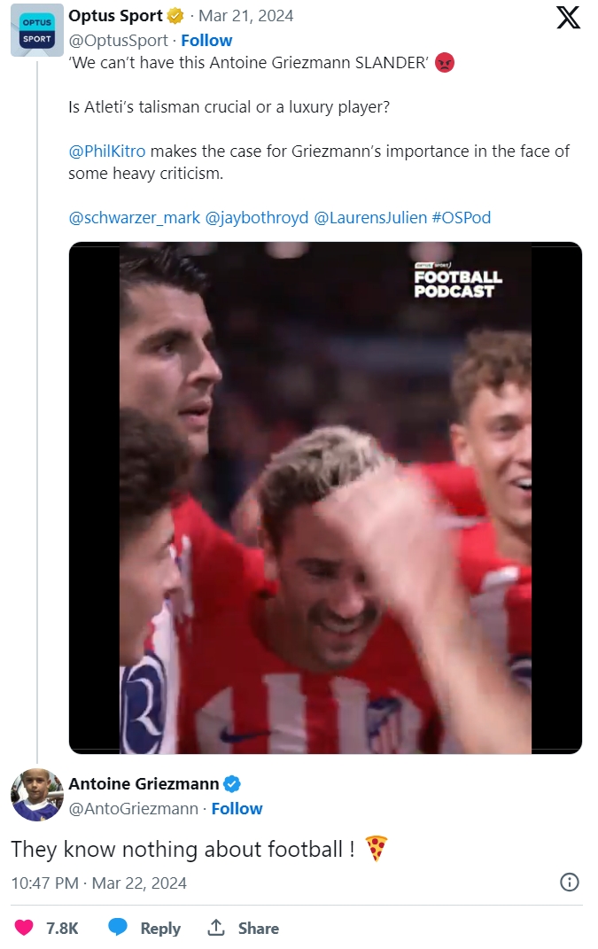 前英国脚称格列兹曼并非世界级球员,格子回应:他们就是球盲????