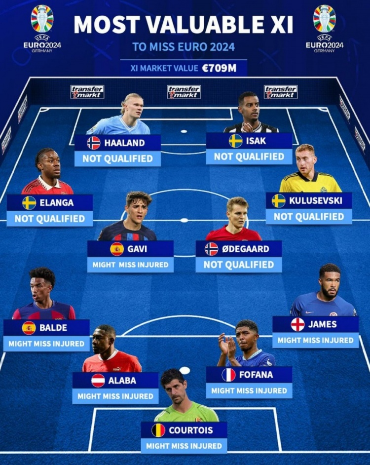 德转列可能缺席欧洲杯最贵阵容:哈兰德&厄德高已无缘,多人伤缺