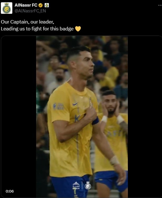 利雅得胜利官推致敬C罗:我们的队长和领袖 带领我们为这队徽而战