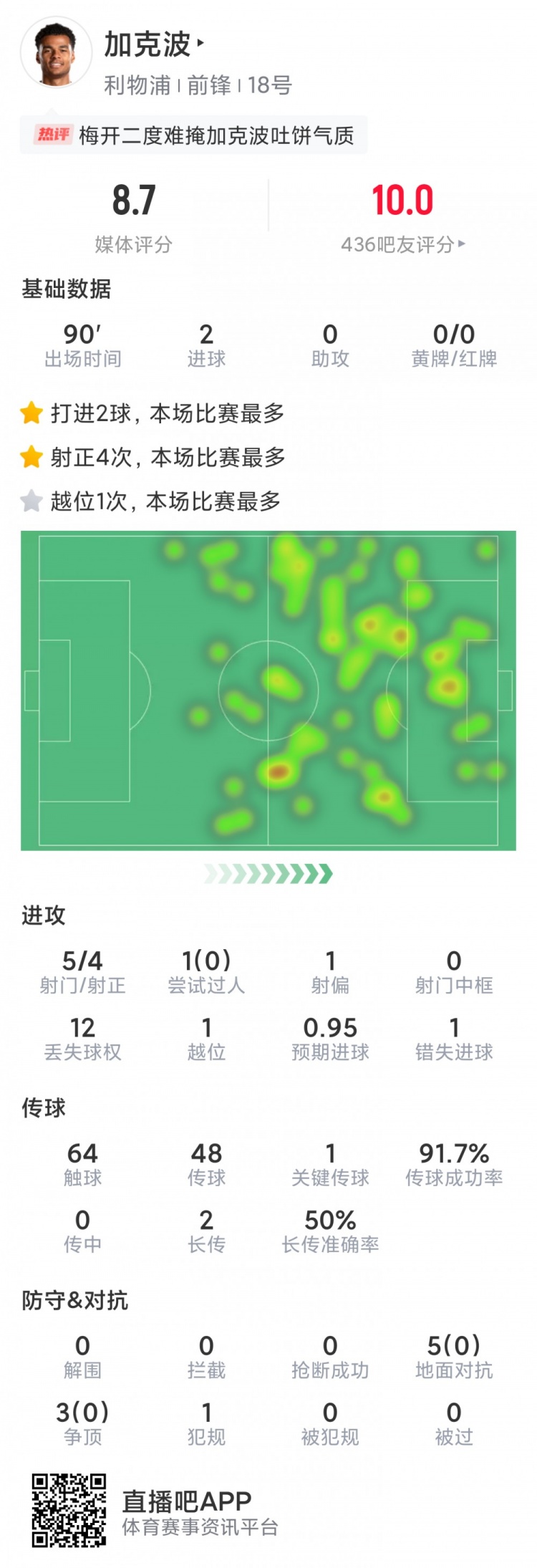 加克波本场数据:梅开二度,5射4正,8次对抗0成功,评分8.7分