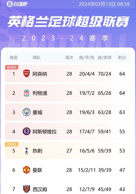 当前英超前七:5队进各级欧战8强,热刺无欧战曼联欧冠小组赛出局