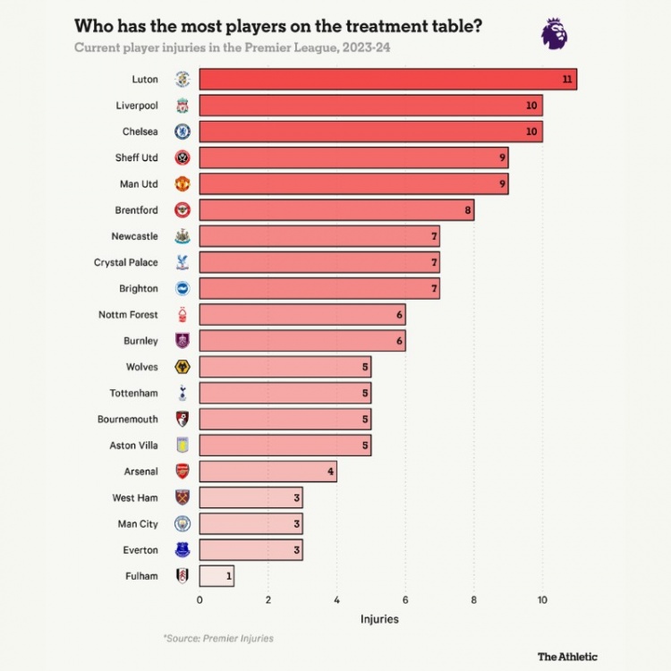 TA统计英超各队当前伤病人数:利物浦切尔西各10人,曼联9人