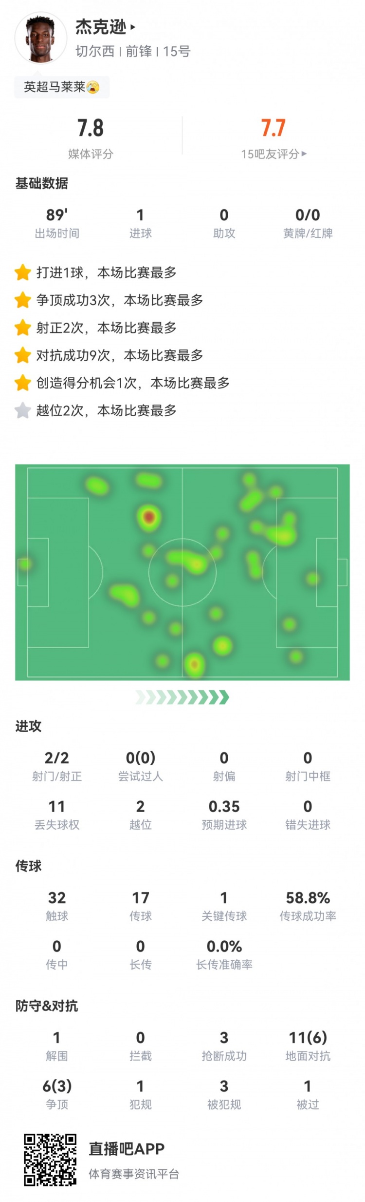 杰克逊全场数据:2射2正1进球58.8%传球 多项数据领跑 评分7.8