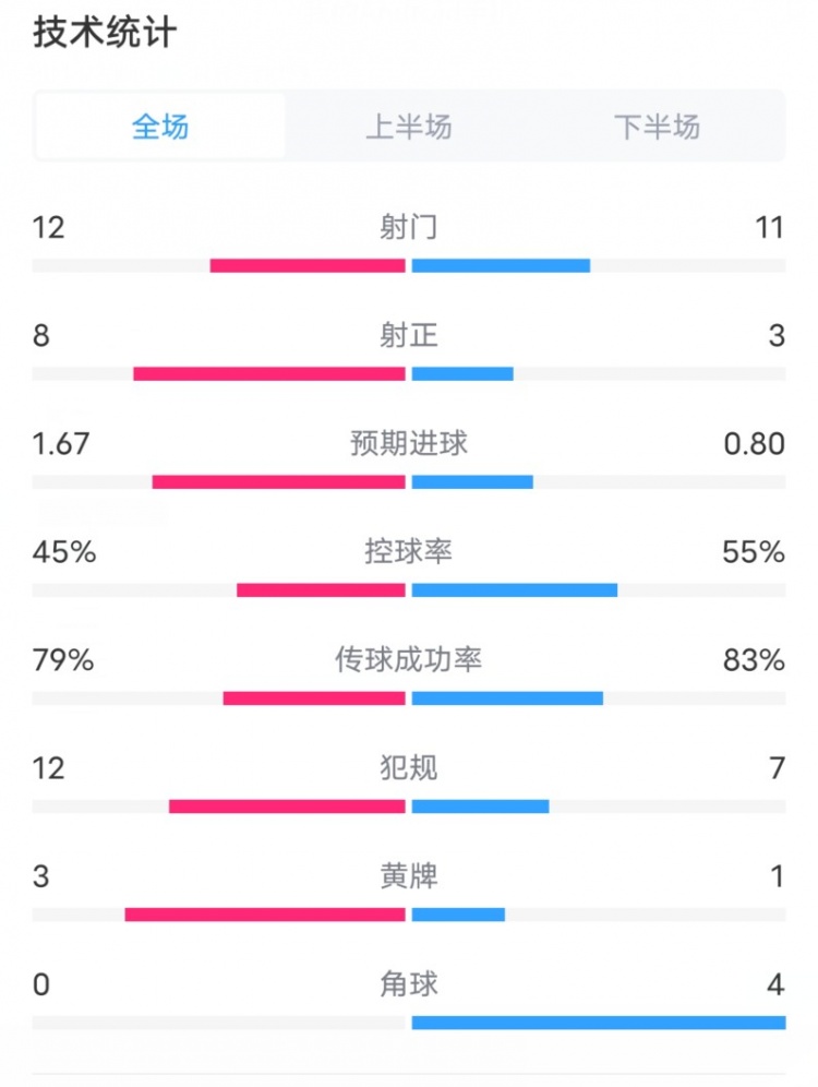 切尔西VS纽卡全场数据:射门12-11,射正8-3,控球率45%-55%