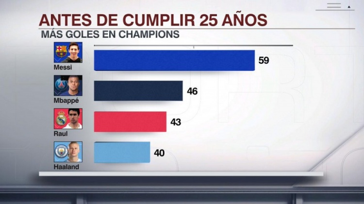 球员U25时期欧冠进球榜:梅西59球居首,姆巴佩46球次席
