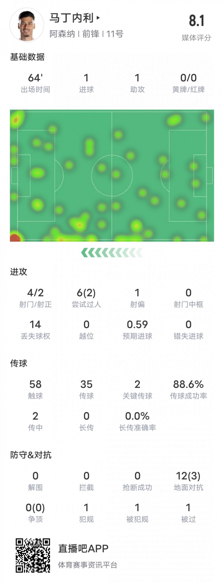 马丁内利本场比赛数据:传射建功&2次关键传球,评分8.1