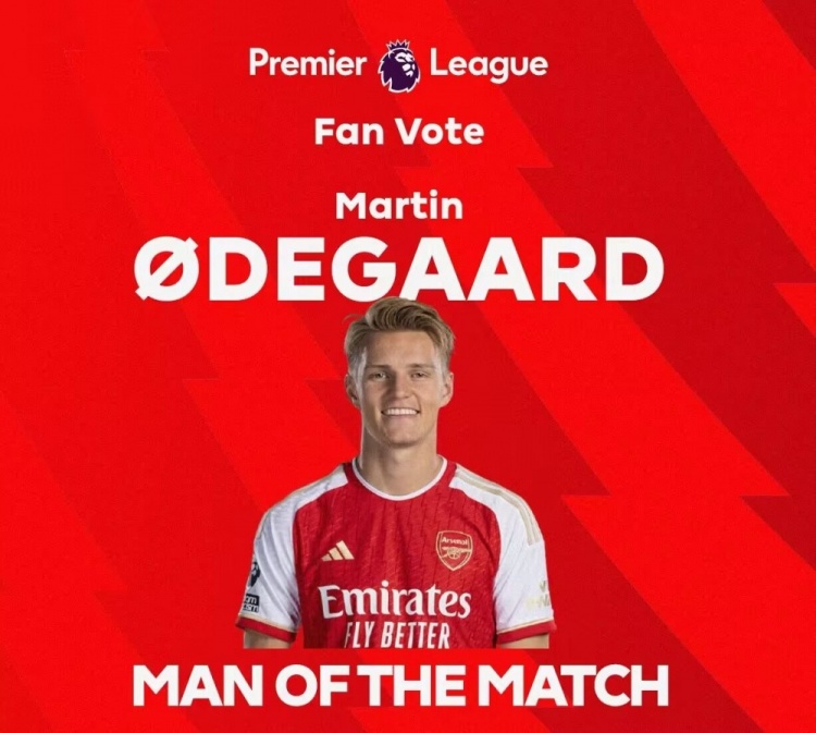 全面表现!英超官方:厄德高当选阿森纳6-0谢菲联全场最佳