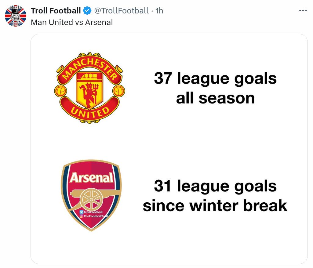 网友调侃:曼联27轮英超37球,阿森纳冬歇期后7场英超31球