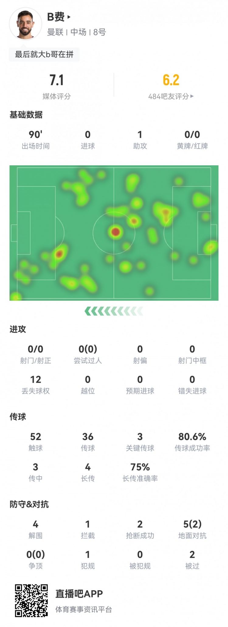 B费全场数据:1次助攻3次关键传球 4解围1拦截2抢断 评分7.1