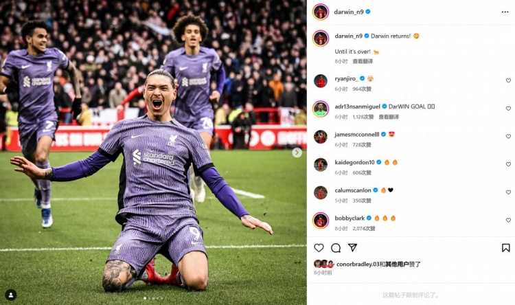 读秒绝杀!努涅斯社媒晒滑跪庆祝:达尔文回来了,直到最后一刻!
