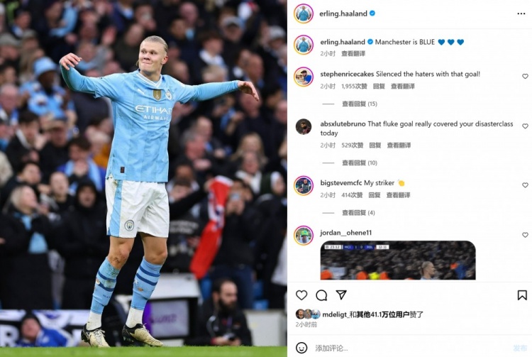 补时破门锁定胜局,哈兰德社媒晒照:曼彻斯特是蓝色的
