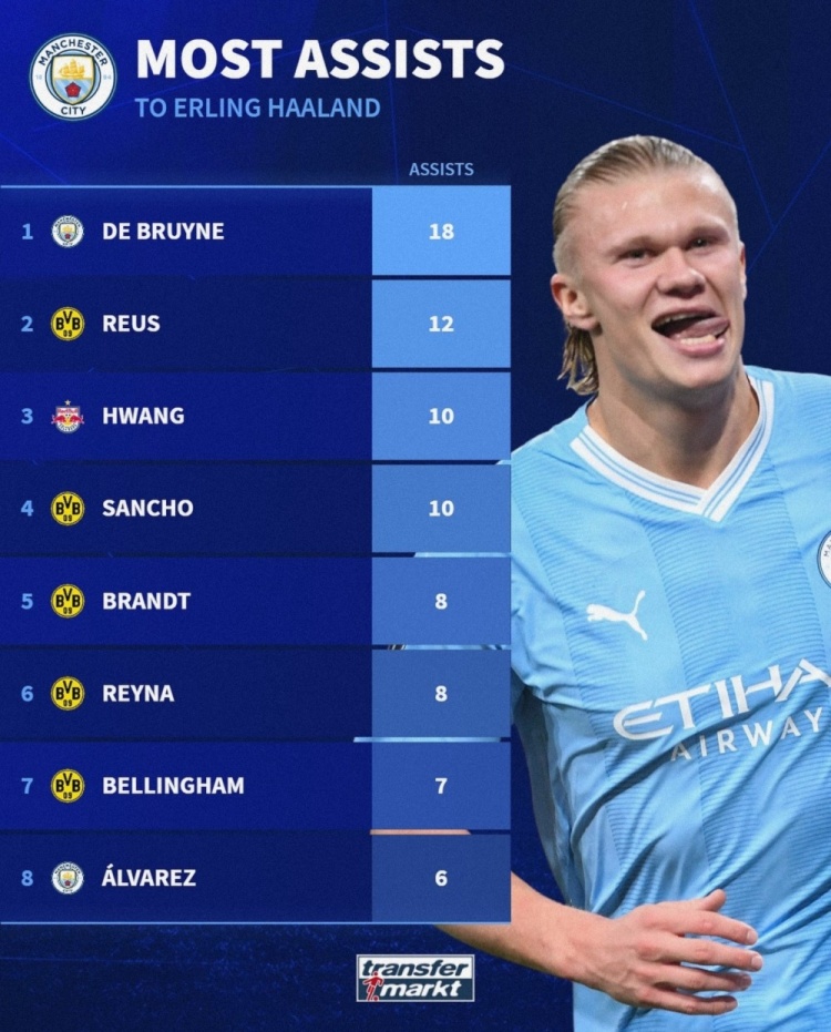 为哈兰德送出助攻最多次数榜:德布劳内18次居首,罗伊斯次席