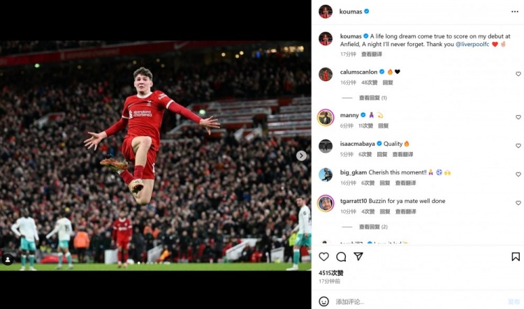 主场首秀破门!18岁库马斯社媒晒照:永生难忘的一夜,梦想实现了