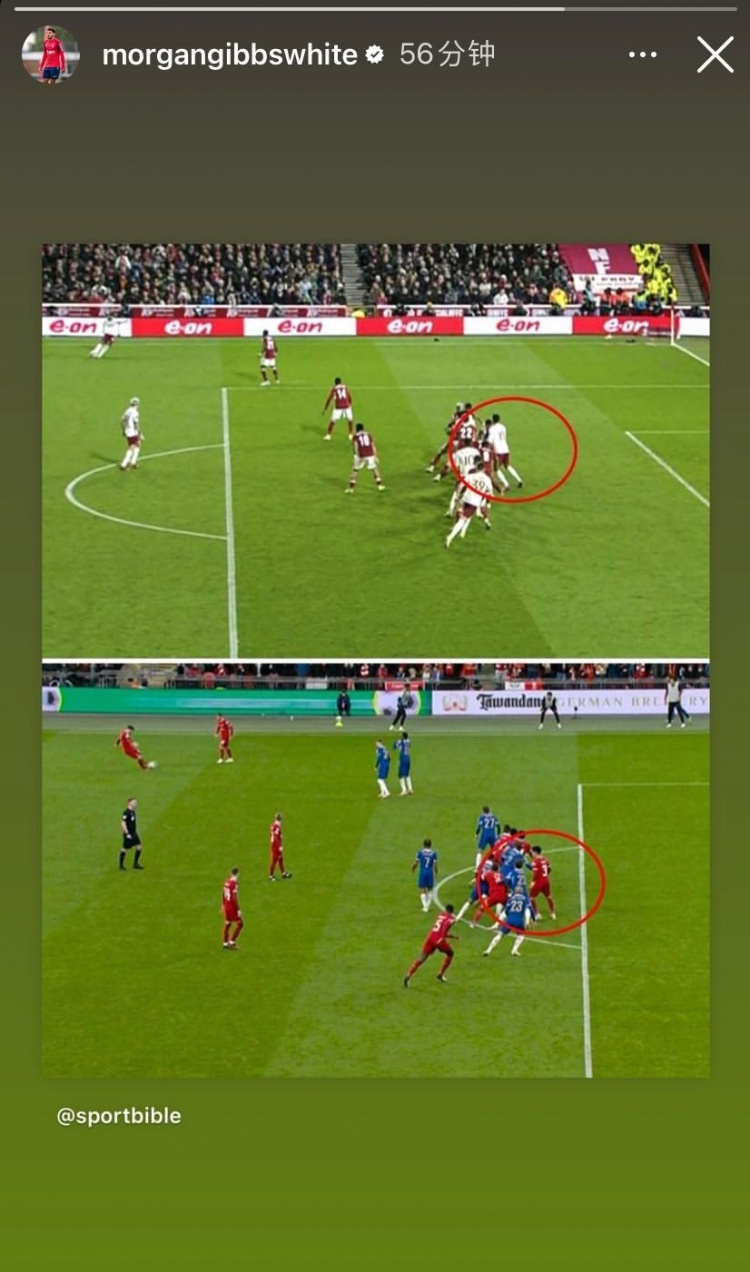 不满判罚?吉布斯-怀特转发卡塞米罗破门和范迪克进球被吹对比图