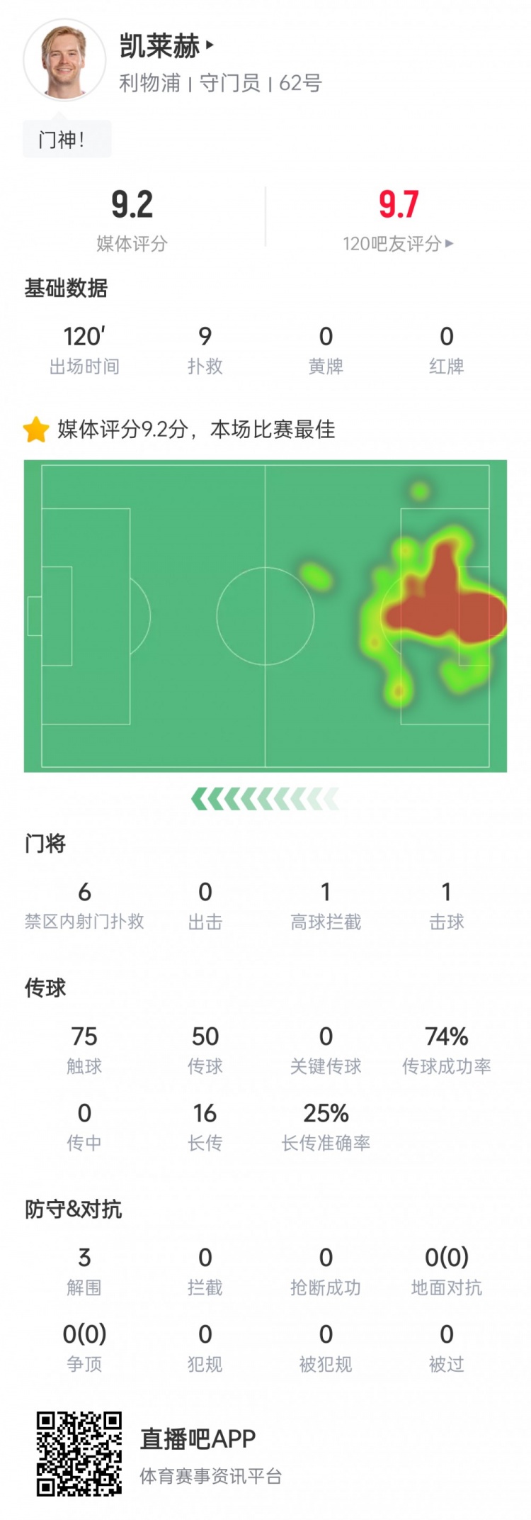 冠军保障!凯莱赫数据:9次扑救3次解围,9.2分全场最高