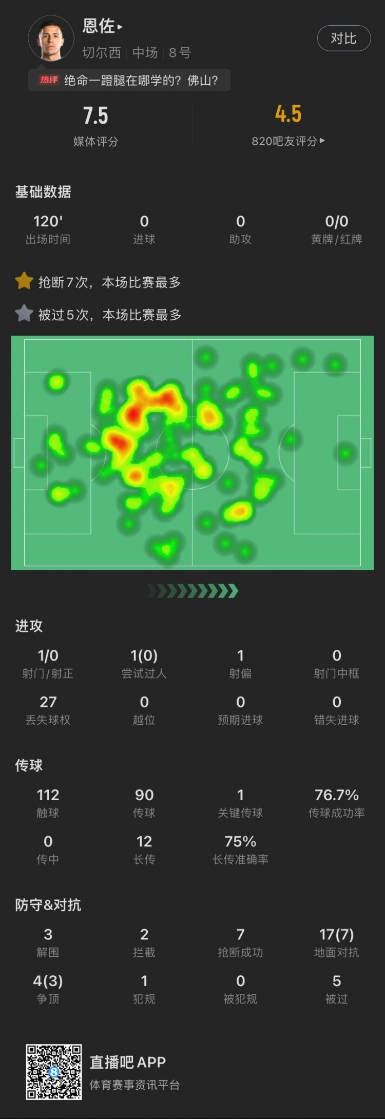 恩佐决赛数据:被过5次、抢断7次均全场最多,21次对抗成功10次