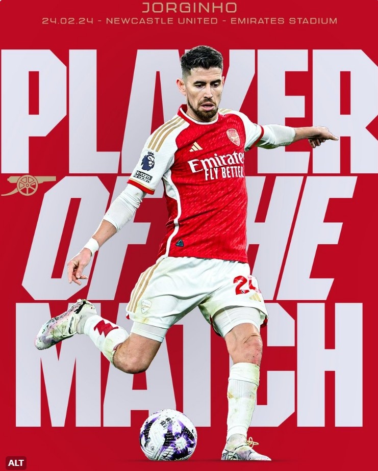 中场节拍器,阿森纳官方:若日尼奥当选对阵纽卡队内最佳球员