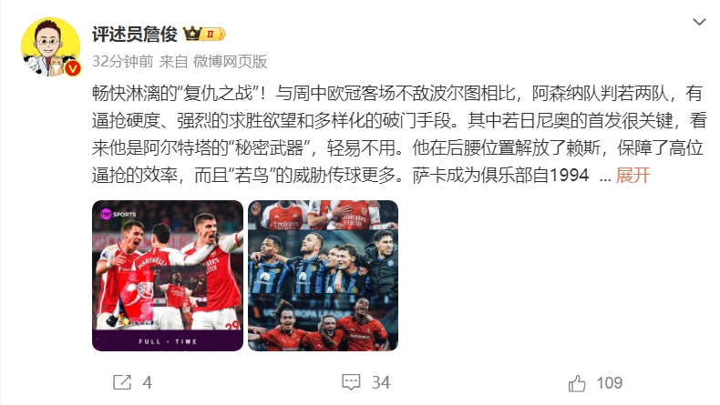 詹俊:阿森纳和周中判若两队,若日尼奥是塔帅秘密武器