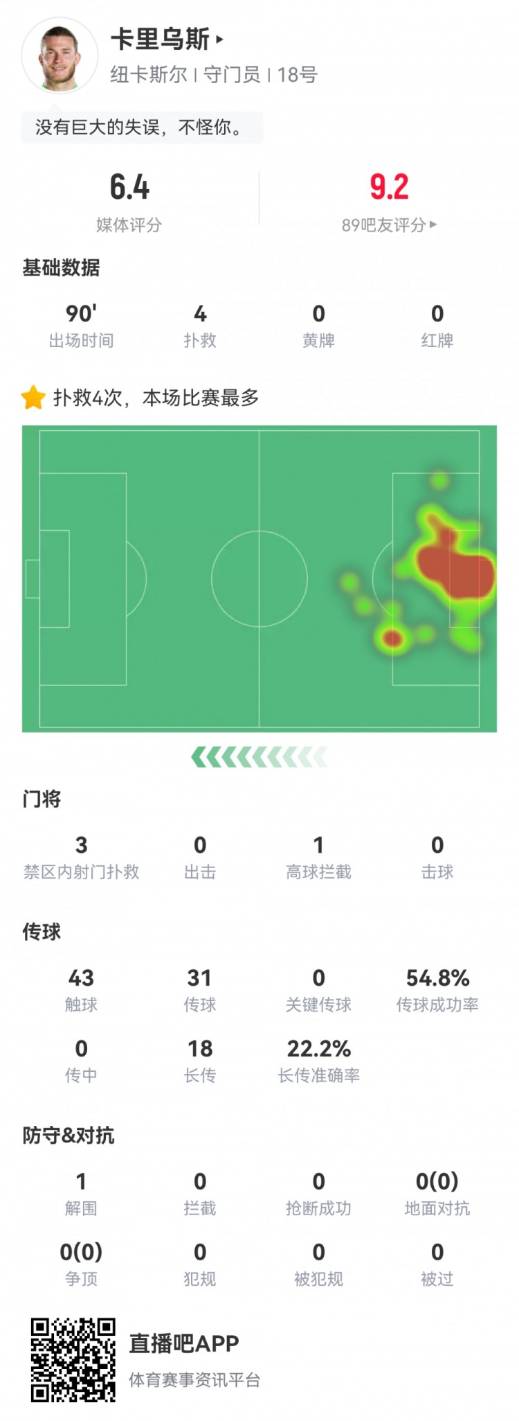 卡里乌斯赛季首秀数据:4次扑救,1次高球拦截,获评6.4分