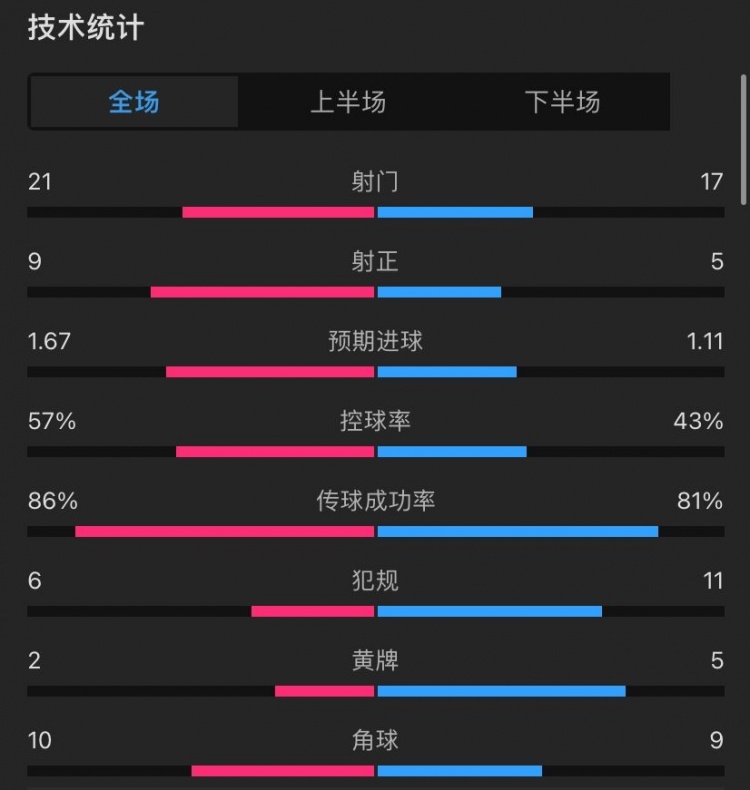 曼联1-2富勒姆全场数据:射门21-17,射正9-5,控球率57%-43%