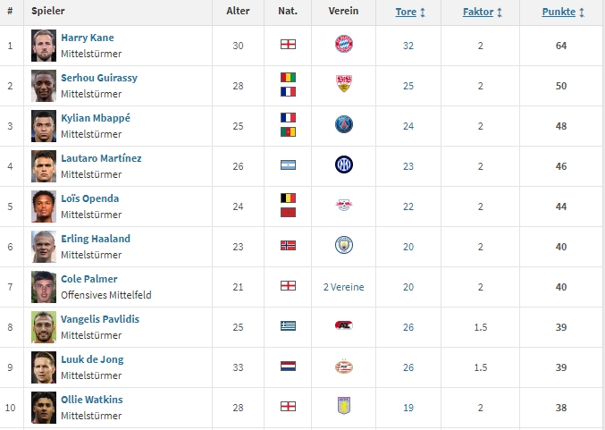 欧洲金靴排名:凯恩领跑 姆巴佩第3、劳塔罗第4 帕尔默进前十