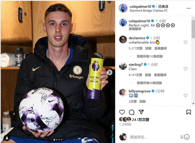 帕尔默社媒晒比赛用球+最佳球员奖杯:完美的夜晚,4粒进球